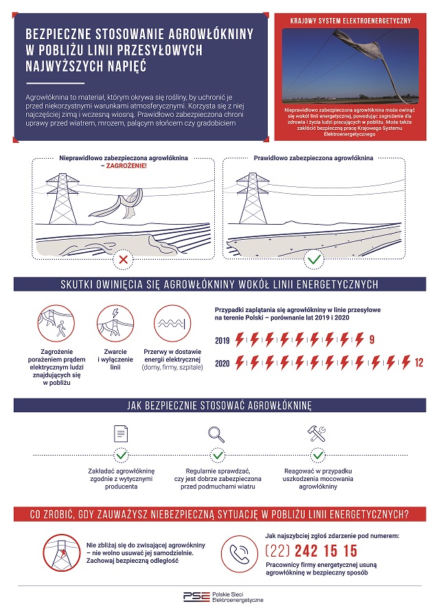 Tylko w zeszłym roku agrowłóknina zwiana z pól 12 razy owinęła się wokół przewodów linii najwyższych napięć, stwarzając zagrożenie dla bezpieczeństwa ludzi. Polskie Sieci Elektroenergetyczne musiały wyłączać linie, co niejednokrotnie zwiększa ryzyko poważnej awarii. Niewłaściwe obchodzenie się z tym materiałem może mieć bardzo poważne konsekwencje. Warto pamiętać o tym zwłaszcza wiosną, gdy agrowłókniny używa się najczęściej.