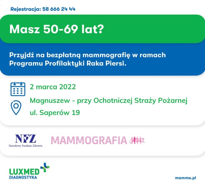 Zachęcamy, aby nie zwlekać z realizacją badań – mammografia jest najbardziej skuteczną metodą wykrywania raka piersi u kobiet powyżej 40 roku życia. Badanie mammograficzne umożliwia wykrycie zmian na bardzo wczesnym etapie rozwoju, kiedy nie są one wyczuwalne podczas samokontroli piersi lub badań palpacyjnych. Wcześnie wykryty nowotwór pozwala na natychmiastowe, skuteczne leczenie oraz daje niemal 100% gwarancję powrotu do zdrowia.
