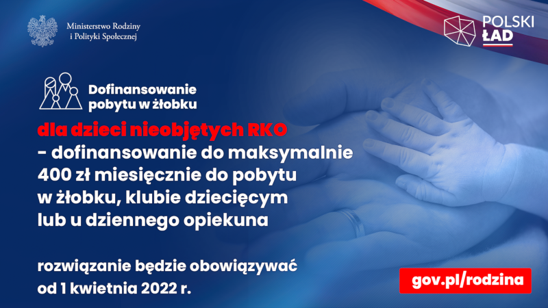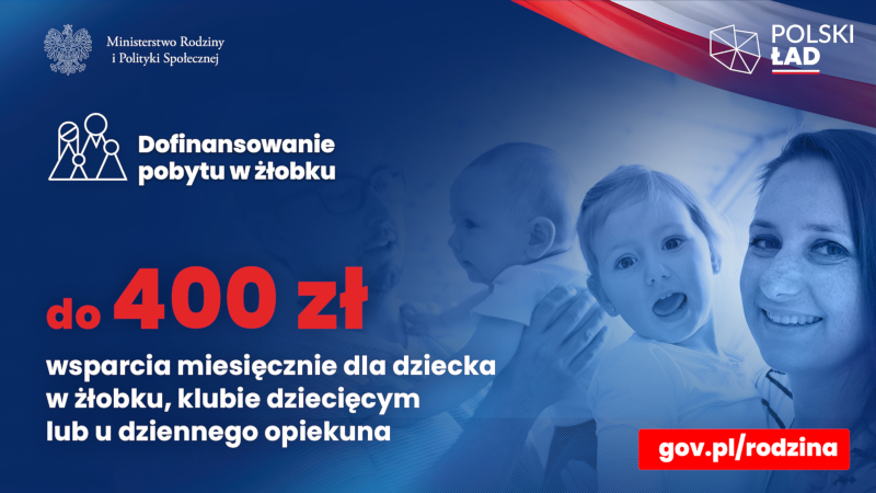 Dofinansowanie obniżenia opłaty za pobyt dziecka w żłobku, klubie dziecięcym lub u dziennego opiekuna to kolejny instrument wsparcia rodzin sprzyjający łączeniu obowiązków rodzinnych z zawodowymi. Dofinansowanie będzie przysługiwać rodzicom (a także opiekunom prawnym oraz innym osobom, którym sąd powierzył sprawowanie opieki nad dzieckiem) na dziecko uczęszczające do żłobka, klubu dziecięcego lub znajdujące się pod opieką dziennego opiekuna i niekorzystające z rodzinnego kapitału opiekuńczego. To np. dzieci pierwsze i jedyne w rodzinie, a także te, które nie spełniają jeszcze lub już kryterium wieku do pobierania rodzinnego kapitału opiekuńczego.