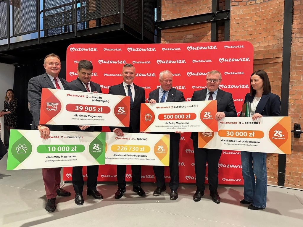 W dniu 06.03.2024r. w Radomiu zostały podpisane umowy o udzielenie pomocy finansowej w formie dotacji celowej z budżetu Województwa Mazowieckiego na realizację zadań w ramach: Mazowiecki Program Zapobiegania Bezdomności Zwierząt – Mazowsze dla zwierząt 2024” w kwocie 10.000 zł, Mazowiecki Instrument Aktywizacji Sołectw Mazowsze 2024 dla sołectw Ostrów i Trzebień w kwocie 30.000zł, Mazowiecki Instrument Wsparcia Infrastruktury Sportowej „Mazowsze dla sportu” w kwocie 226.730zł, Mazowsze dla straży pożarnych, na zakup wyposażenia dla jednostek OSP: OSP Magnuszew, OSP Wilczkowice Dolne, OSP Rozniszew, OSP Mniszew, OSP Chmielew, OSP Anielin w kwocie 39.905 zł, Mazowiecki Instrument Wsparcia „Autobusy dla mazowieckich szkół” edycja 2023-2024 w kwocie 500.000 zł. W imieniu Zarządu Województwa Mazowieckiego umowę podpisał Rafał Rajkowski Wicemarszałek Województwa Mazowieckiego, a Urząd Miasta i Gminy Magnuszew reprezentował Burmistrz Marek Drapała i Skarbnik Agnieszka Szaraniec.